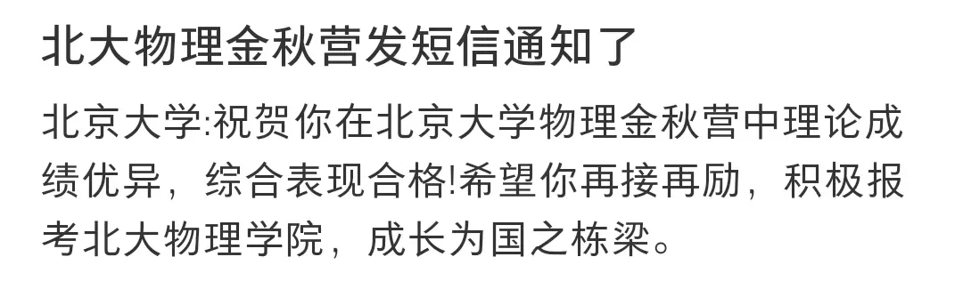 北京大学2024年物理金秋营活动于10月7日举办,目前据自主选拔在线团队所知,北京大学2024年金秋营考试成绩已经公布,考生可以登录报名系统查看个人成绩,今年北京大学物理金秋营成绩在网站先发布分数,之后有些同学陆续收到评级短信。