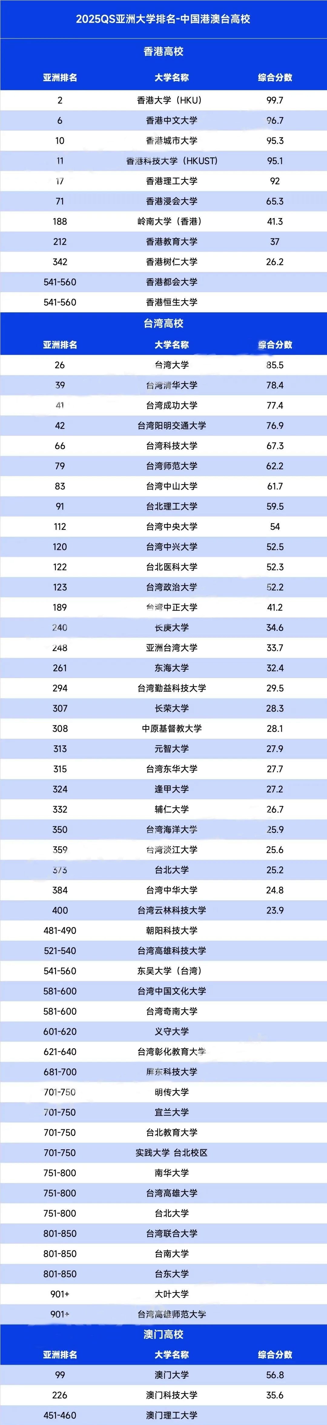 中国共有197所大学进入QS2025亚洲大学排行榜。其中,中国内地135所,中国香港11所,中国台湾48所,中国澳门3所。