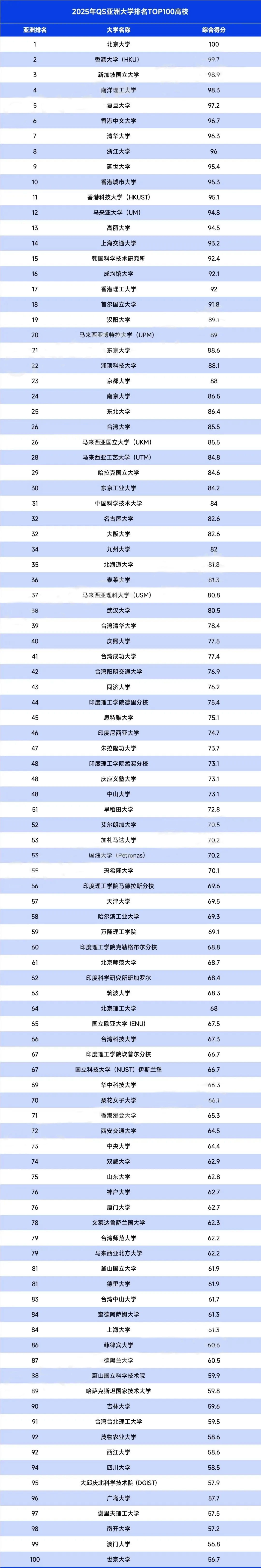 QS发布的2025亚洲大学排名中,中国、日本、韩国、新加坡高校表现依旧强势,而亚洲高校TOP10中,更是有7所中国高校。