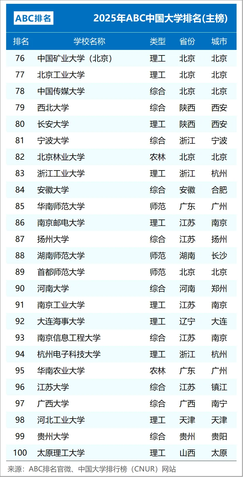 2025年ABC中国大学排名结果显示,清华大学、北京大学蝉联全国前二,浙江大学、中国科学技术大学并列第3,复旦大学、上海交通大学、南京大学并列第5,中国人民大学第8,哈尔滨工业大学第9,北京航空航天大学第10。其中,哈尔滨工业大学时隔4年,再次归位全国前十。