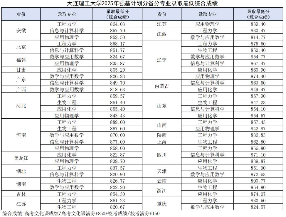 根据教育部《关于在部分高校开展基础学科招生改革试点工作的意见》(教学〔2020〕1号)等文件要求,按照《大连理工大学2025年强基计划招生简章》有关规定,通过组织专家面试,经学校研究同意,现发布大连理工大学2025年强基计划分省分专业录取最低综合成绩。