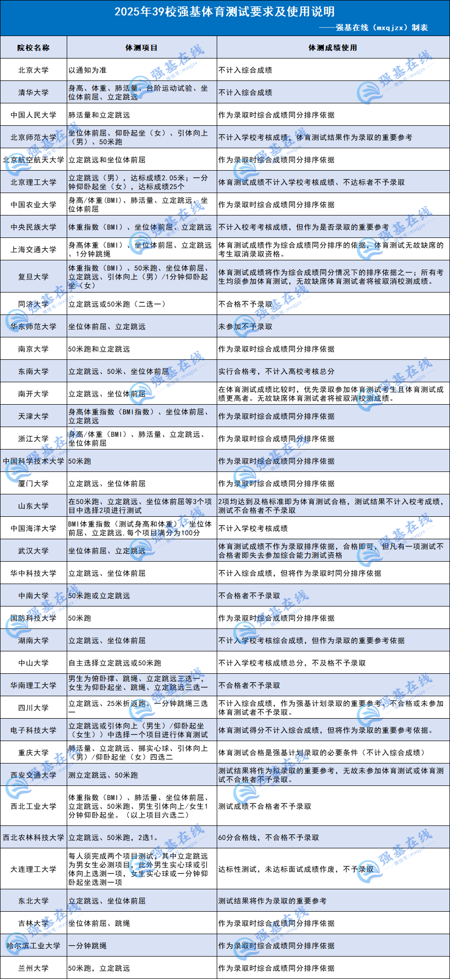 下面表格为大家汇总整理了2025年39校体育测试项目&成绩使用说明。