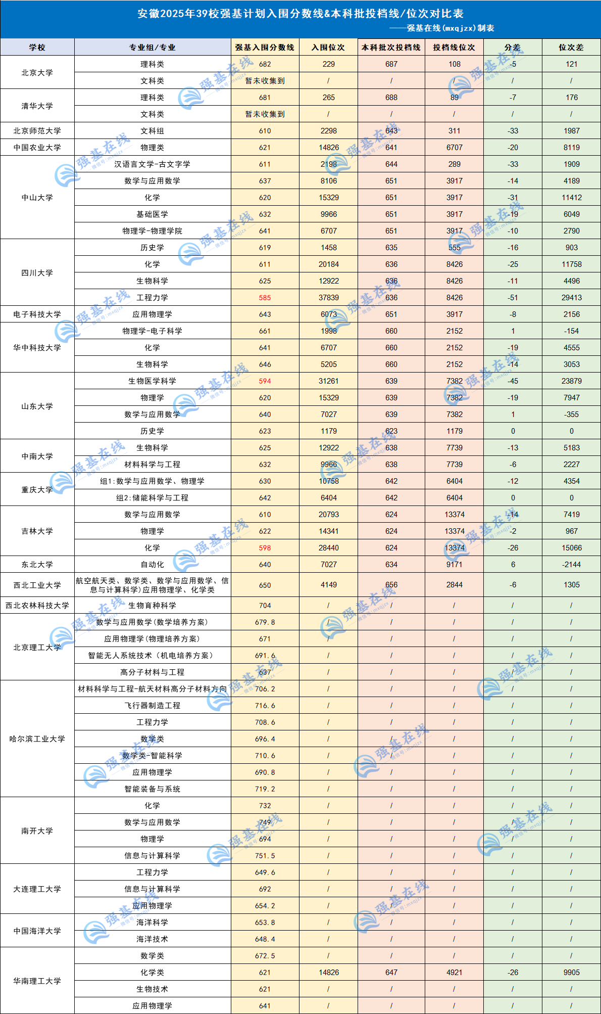 2025年37所(除中央民大、国防科大2校)强基计划高校在安徽进行招生,通过数据对比分析,强基入围分数线普遍低于同类型专业统招线,分差在2-51之间。