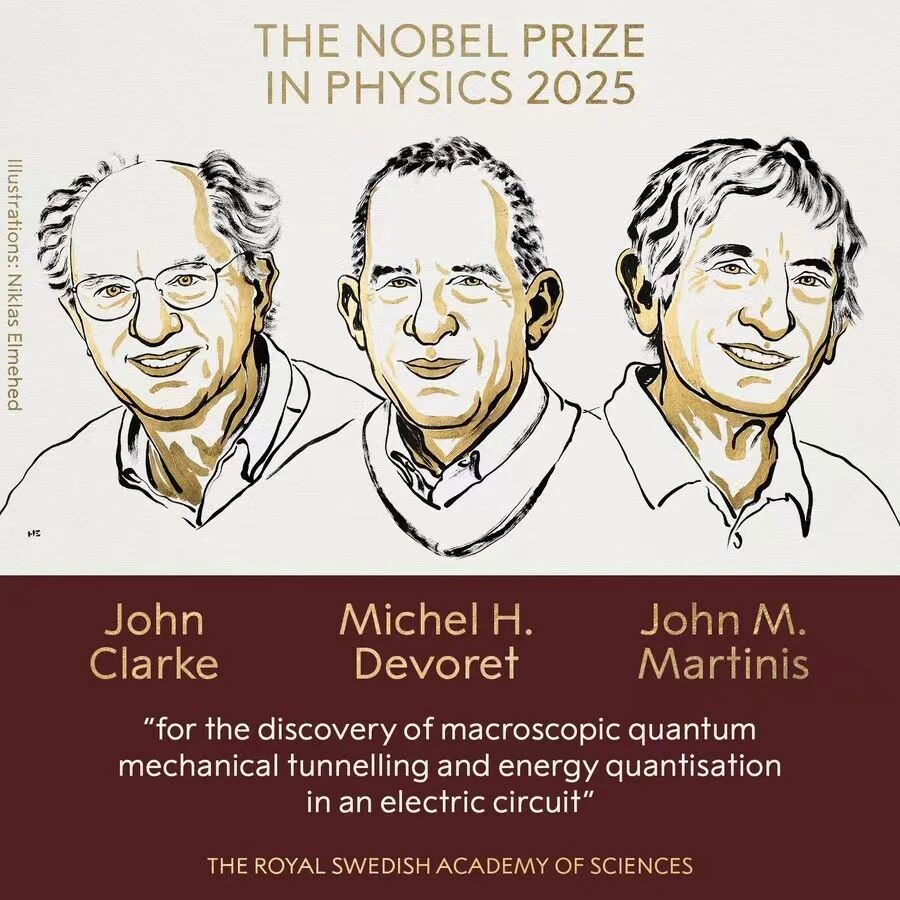 2025年诺贝尔物理学奖被授予约翰·克拉克、米歇尔·H·德沃雷、约翰·M·马丁尼斯,因他们在电路中发现宏观量子力学隧道效应与能量量子化现象。