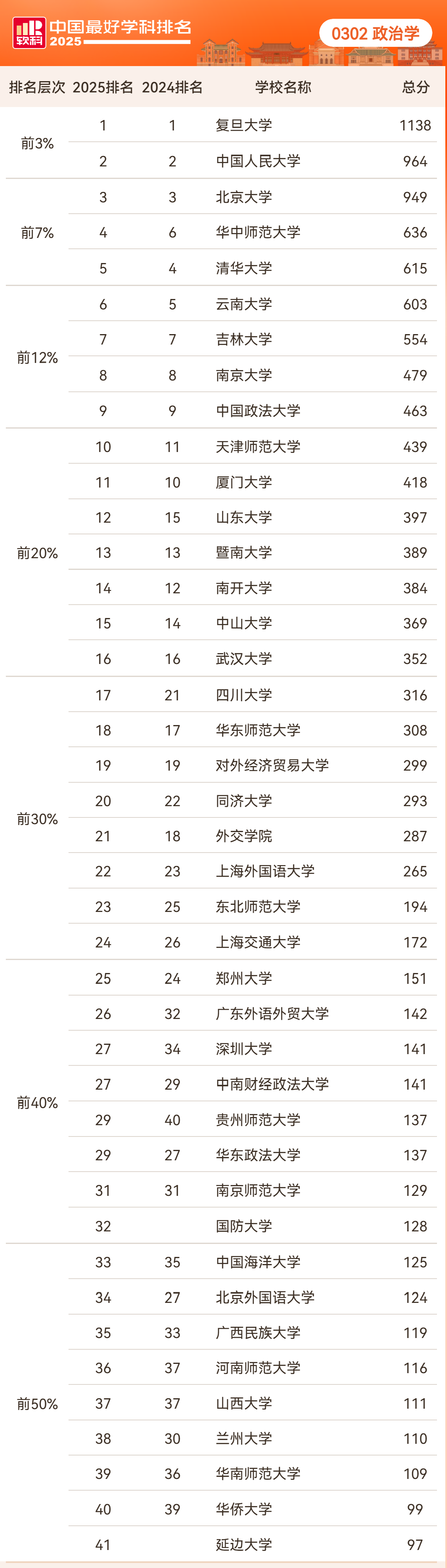 2025年软科中国政治学学科排名显示,该领域的竞争格局基本稳定,但部分高校排名变动显著。