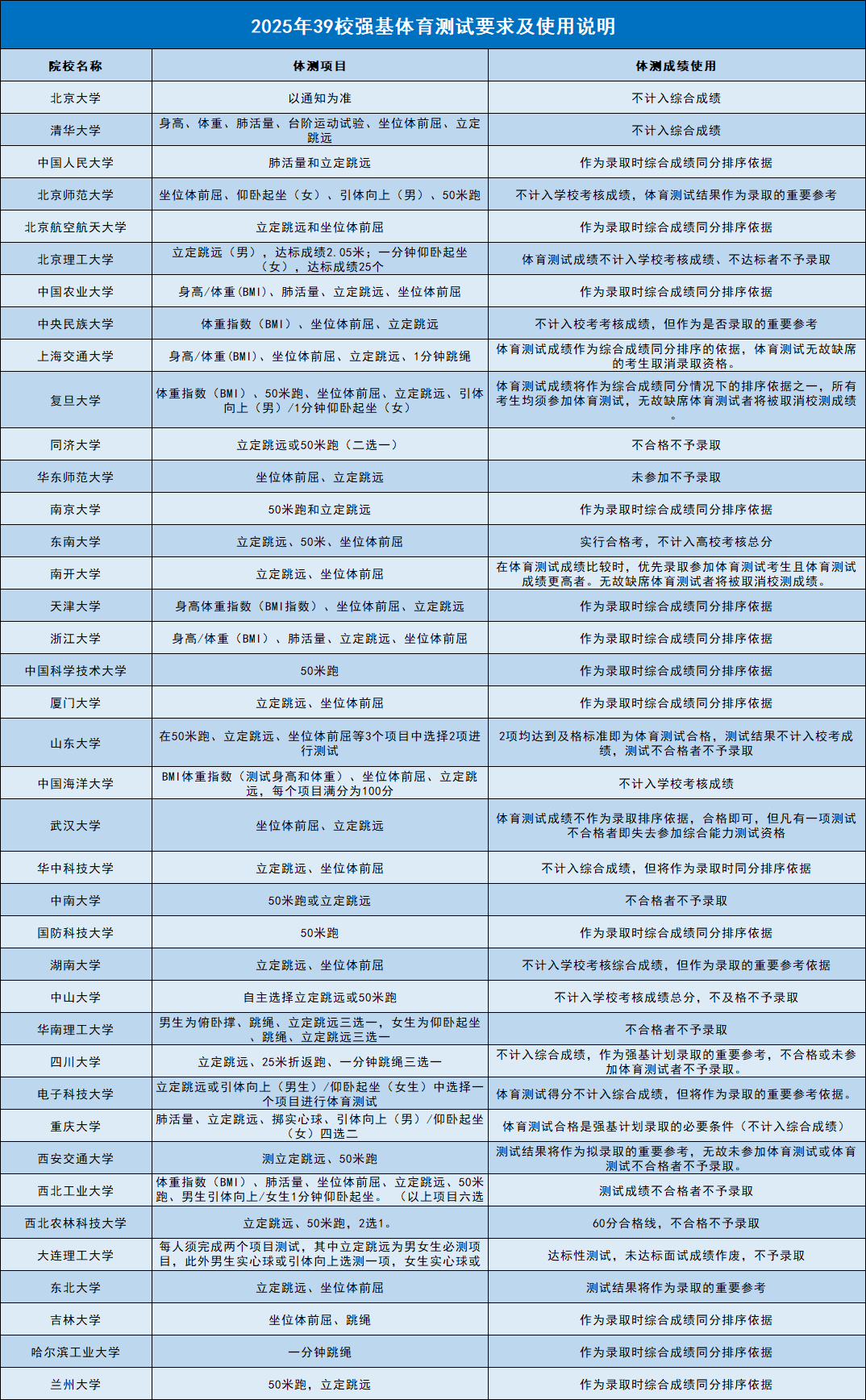 2026强基计划备考已启动!强基计划体育测试考什么?影响录取吗?一起来看!为帮助高三及低年级学生家长更好地了解强基计划相关政策,高效备战。自主选拔在线整理了各院校强基体育测试详细相关要求,一起来看!