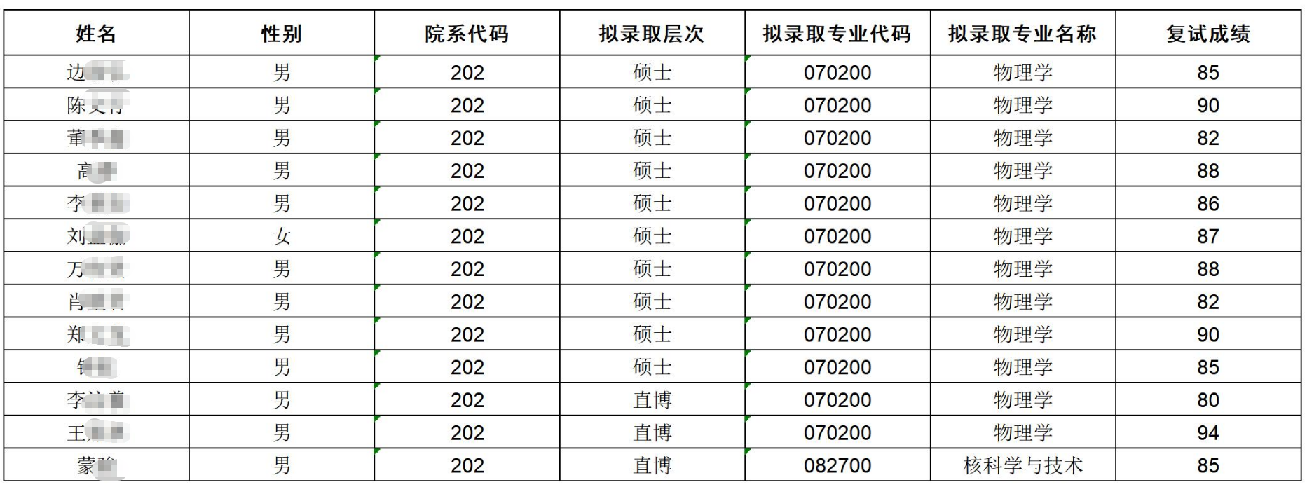 专业分布:绝大多数学生(共12人)继续在“物理学(070200)”专业深造,有1名直博生转入“核科学与技术(082700)”专业,显示出培养方向在主体稳定的基础上,也提供了一定的跨学科发展空间。