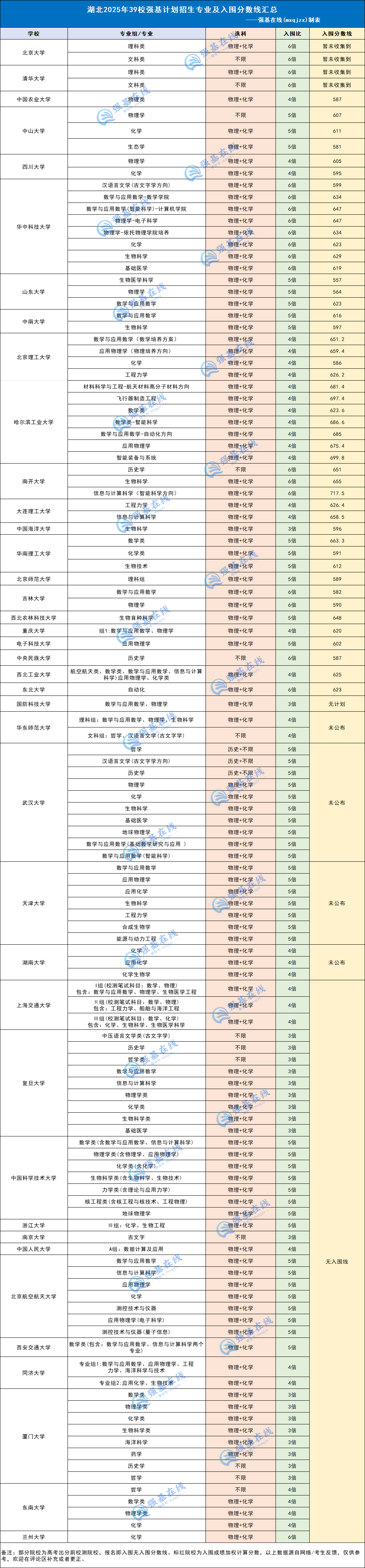 ③湖南大学、天津大学、武汉大学、华东师范大学未公布强基入围分数线,国防科技大学1校在湖北地区没有招生计划。