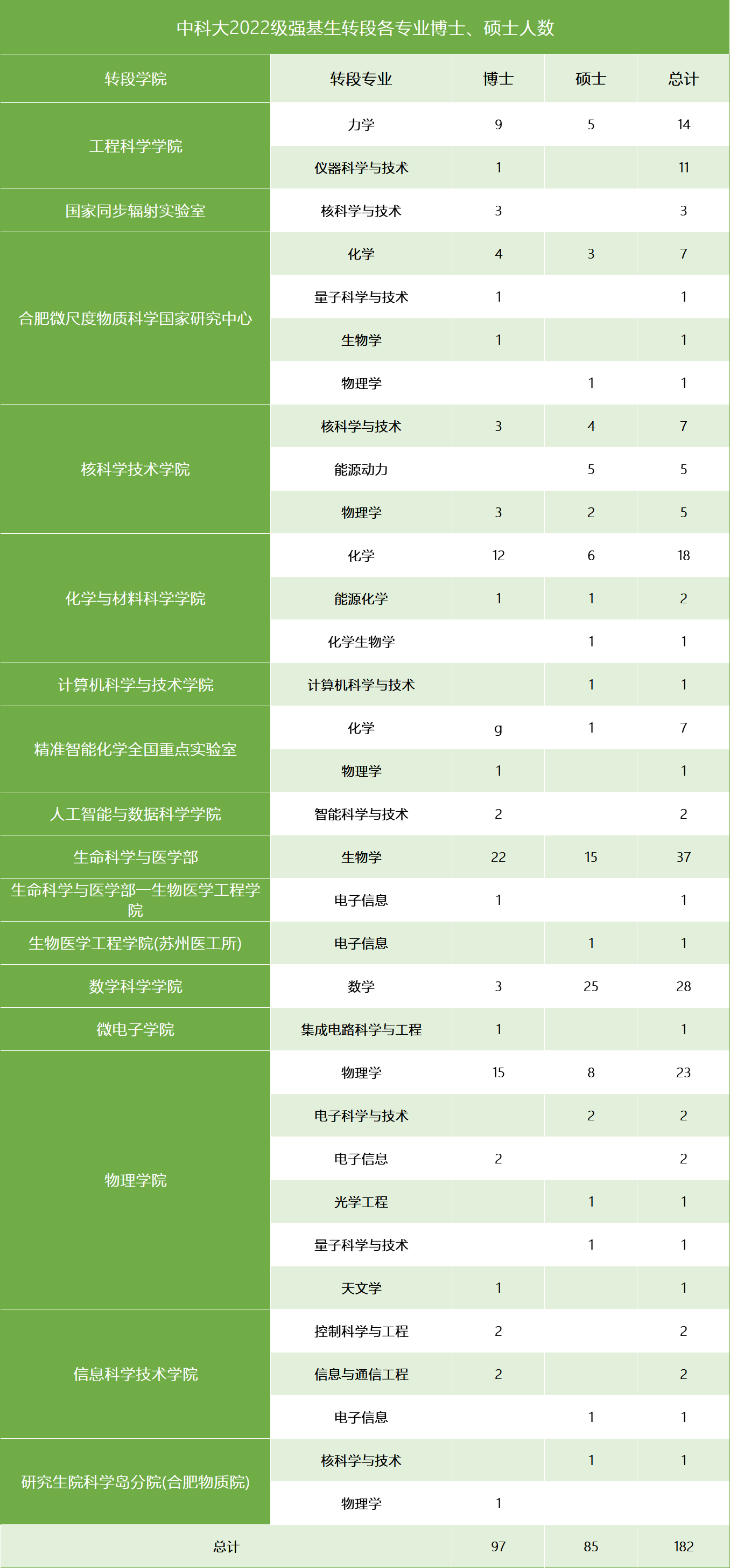 2022年中科大强基招生计划210人左右,2026年中科大强基成功转段182人,直博97人,硕士85人,转段率高达86.67%。