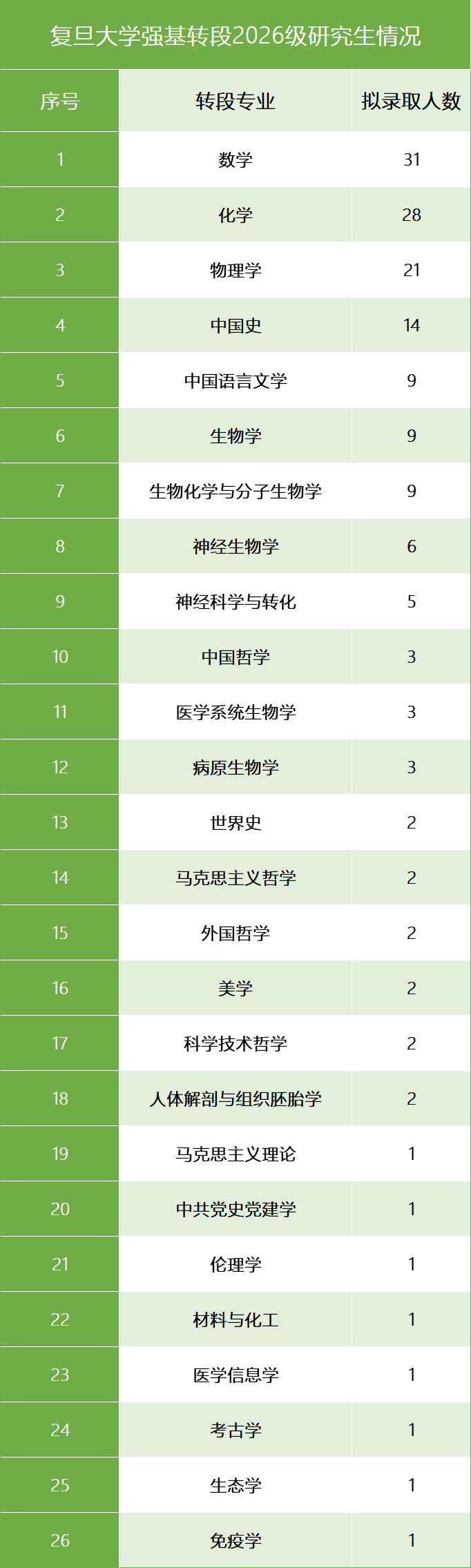 2026年复旦强基,录取约191人,转段161人,转段率84.3%。涵盖数学、物理、化学、生物、哲学、历史、汉语言文学、基础医学等方向;