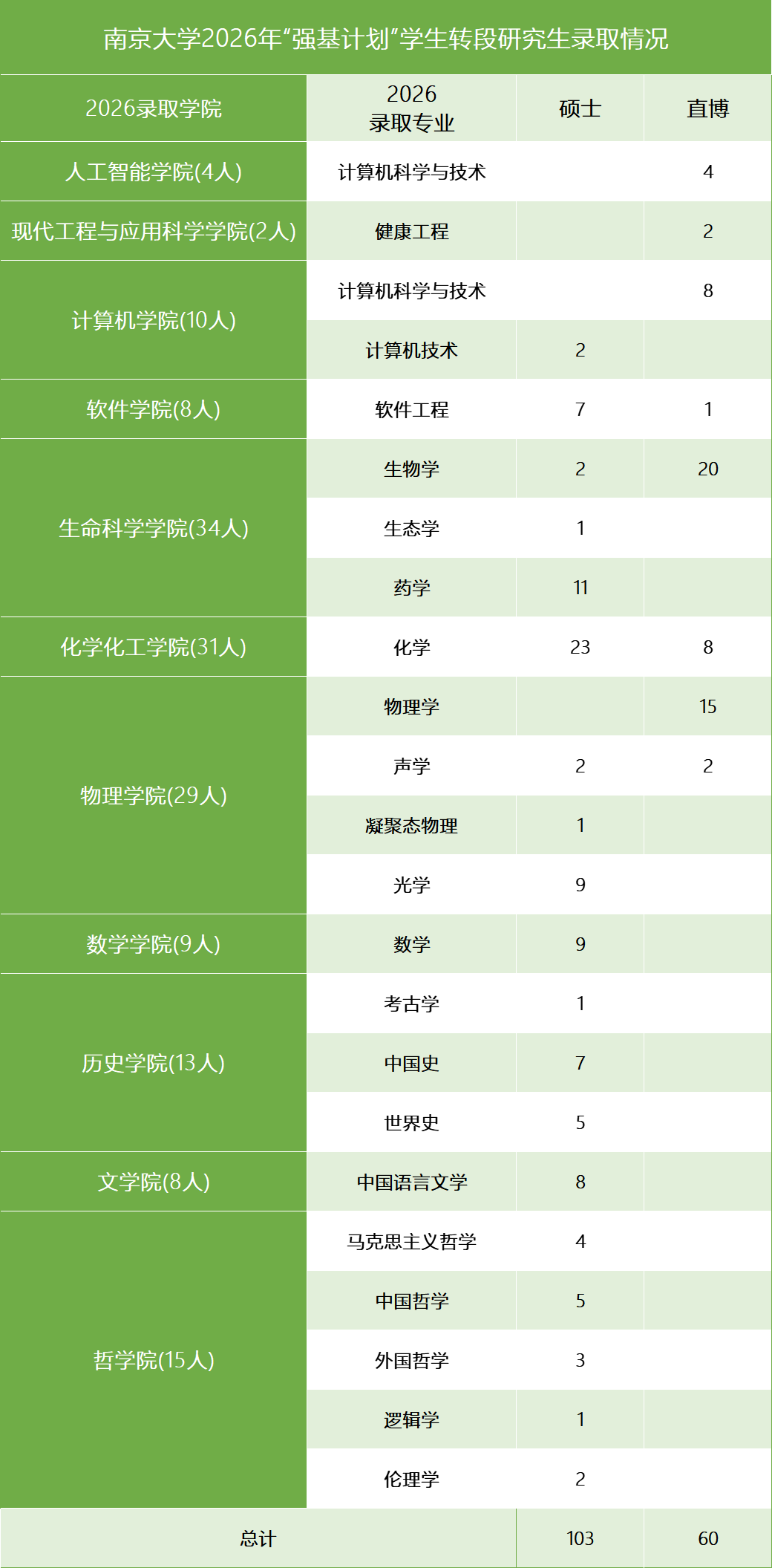 2022级录取210人,2026年成功转段163人,转段率约77.6%。南京大学强基计划涵盖数学、物理、化学、生物、哲学、汉语言文学、历史学等8个方向。