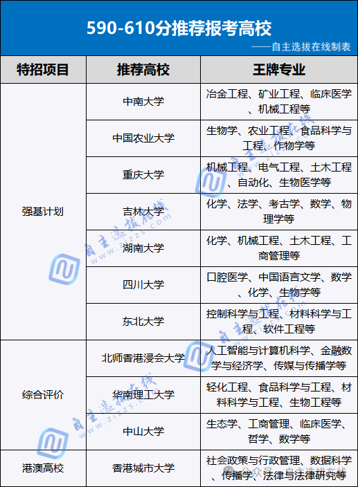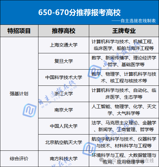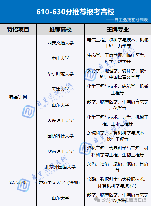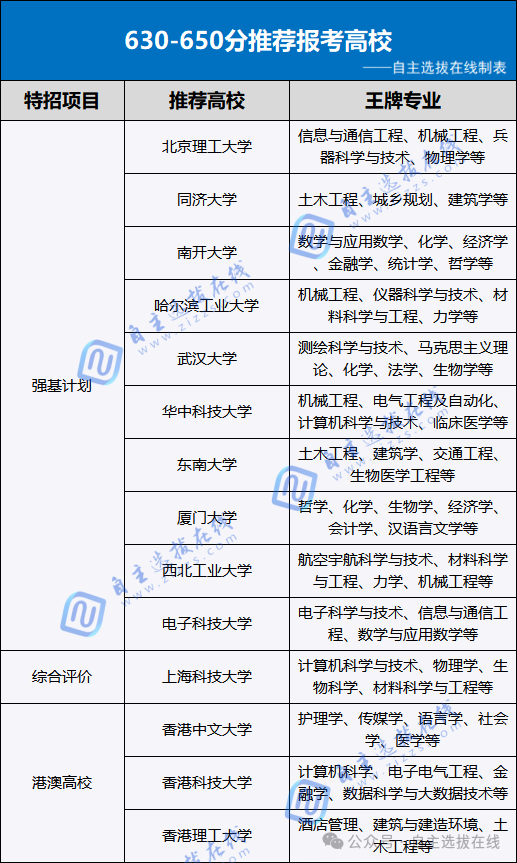 近期,2026各港校内地招生正在申请中,以上纽为首的综合评价高校将随时开启报名,强基计划择校也开始提前规划。所以这段时间不仅是各省高三考生期中考试的时间,更是特招升学的重点备考期!很多考生家长提问:期中考了650分,可以报哪些院校?报考强基院校要多少分?630分能报哪些综评院校?……为助力考生及家长精准定位,自主选拔在线团队特别整理了550-680分各分数段对应的强基/综评/港澳院校及王牌专业推荐,2026届以及低年级的同学速看!