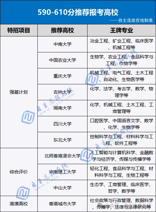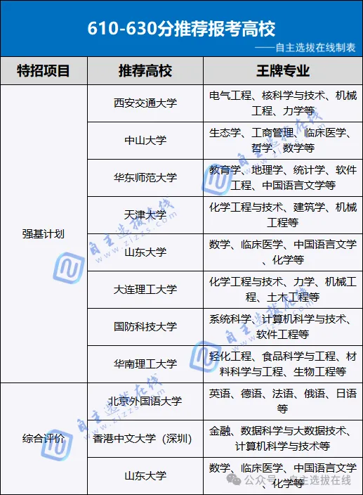 备注:由于各省分数线相差较大,各分段推荐高校在部分地区有机会通过统招直接录取,而在部分省市则需要强基综评等特殊招生降分上岸。所以各高校推荐的王牌专业既包含统招可报考的专业、也包含强基综评等特招设置的专业。