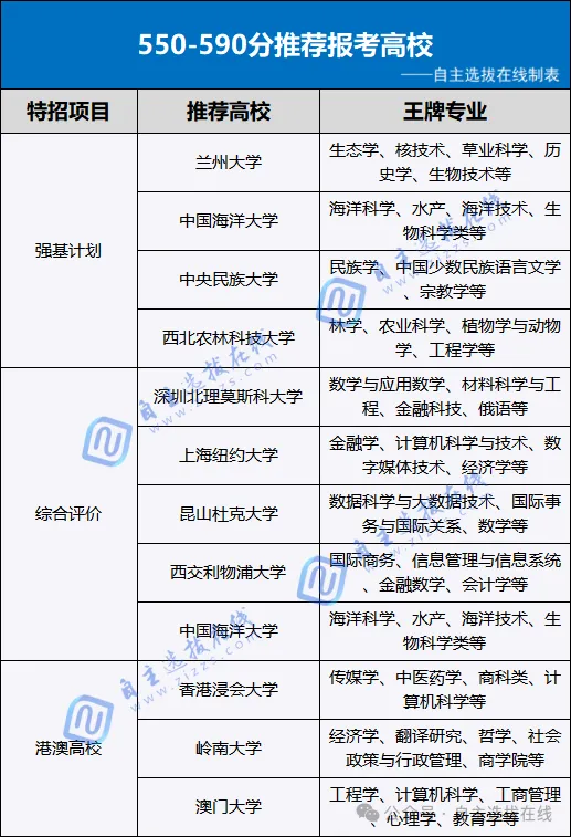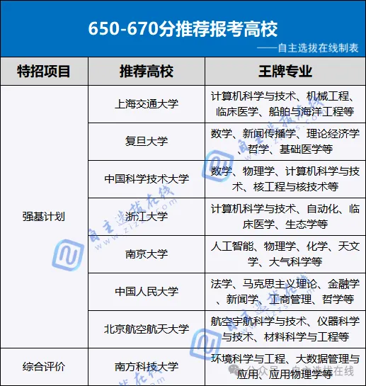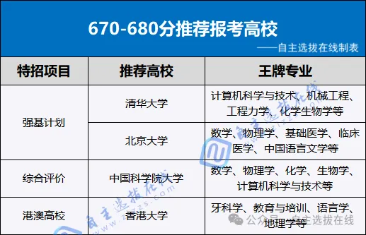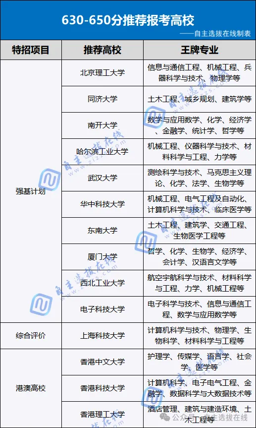 很多考生家长提问:期中考了650分,可以报哪些院校?报考XX校的强基要多少分?630分能报哪些综评院校?……为助力考生及家长精准定位,自主选拔在线团队特别整理了550-680分各分数段对应的强基/综评/港澳院校及王牌专业推荐,供大家参考!