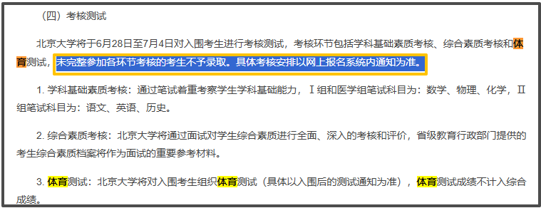 体测作为北大强基计划校测的一部分,虽然不计入综合成绩,但是未完整参加各环节考核的考生不予录取。