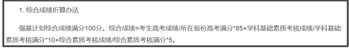 综合成绩=考生高考成绩/所在省份高考满分*85+学科基础素质考核成绩/学科基础素质考核满分*10+综合素质考核成绩/综合素质考核满分*5。