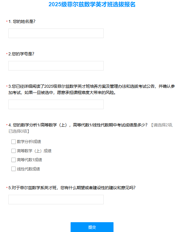 (4)若有未能完全满足以上条件(2)或(3),但是对数学有强烈兴趣的同学,经任课教师认可,亦允许报名。需学生本人提出书面申请(申请书格式不限,简单陈述申请理由即可),由任一数学任课教师签字并在报名截止之前提交扫描版到曲老师邮箱quy@sustech.edu.cn。
