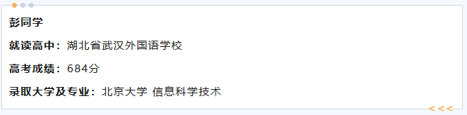 我高中三年的成绩并不稳定,考过年级第一,也跌到过年级二十二名。语文算是相对比较弱势的学科,但是随着语文学习经验的总结和语文素养的提升,不仅对语文成绩带来了提升,也让总分得到了质的飞跃,从650分、660分提升至670分、680分。最终以684分的成绩被北京大学电子信息类录取,圆了我的梦想。