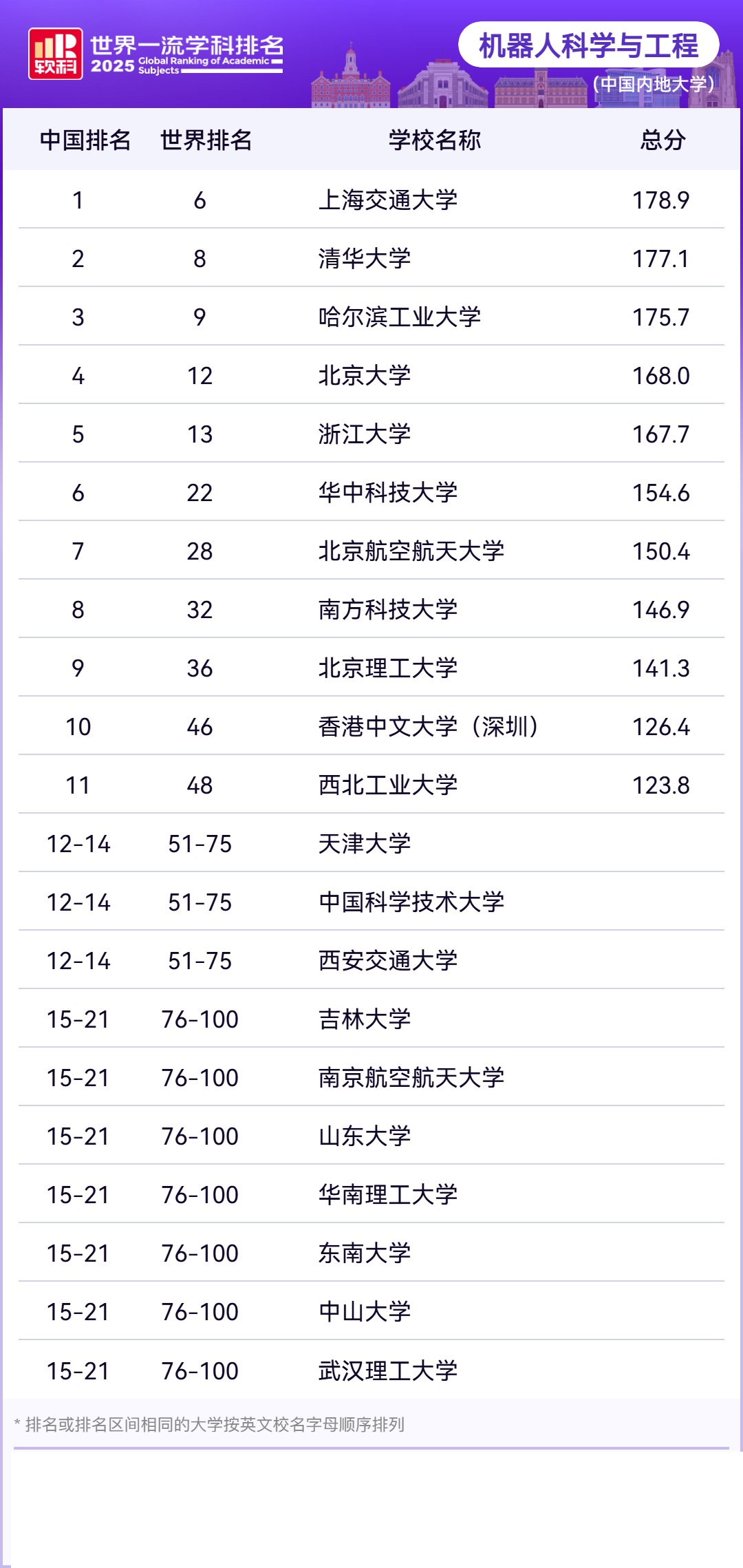 2025年软科世界一流学科中国内地高校排名—机器人科学与工程