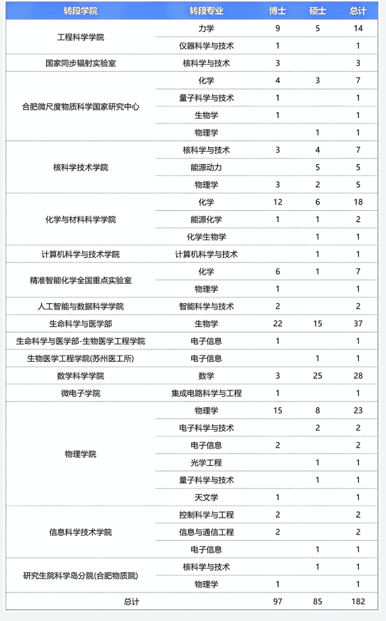 在182名转段生中,97人直博,占比约53.3%,85人攻读硕士,占比约46.7%。