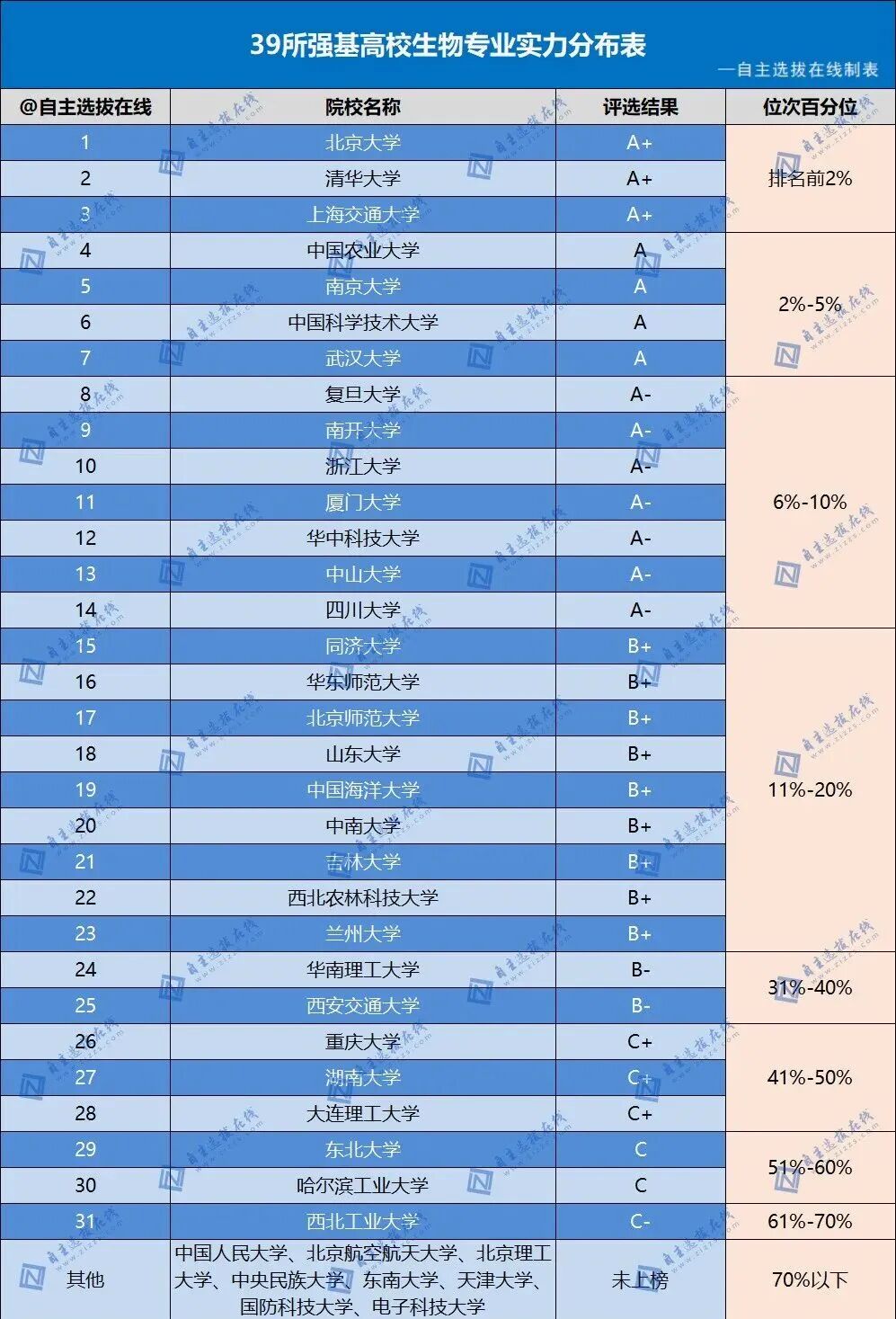 | 生物科学类(4所) | 北京大学、复旦大学、中国科学技术大学(含生物科学、生物技术)、厦门大学(生物科学、生物技术) |