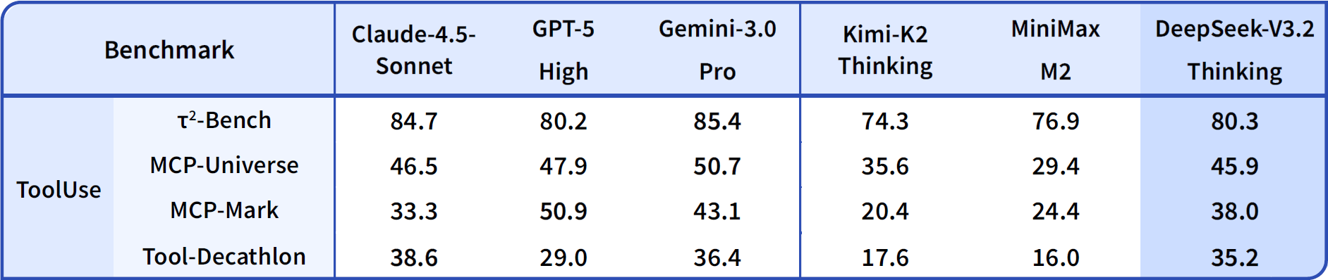 表2:DeepSeek-V3.2 与其他模型在各类智能体工具调用评测集上的得分