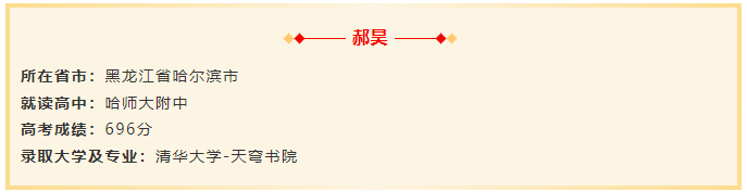 2026年强基计划备战已经开始!往年学姐学长的经验不仅能够提供更详细备考攻略,还能让低年级考生在报考强基的过程中避免“踩坑”,给下一届考生很大的帮助!今天为大家分享来自黑龙江省哈尔滨市哈师大附中郝同学的高考备考经历。他平时成绩在学年前5,获得过数学、生物、化学竞赛省二奖项,还参加过清华暑期学堂和北大冬令营,最终以高考696分上岸清华大学!一起来看他是如何做的?