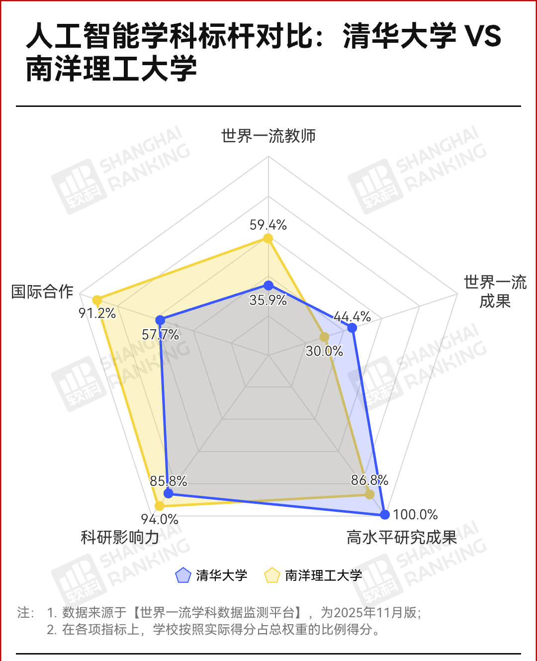 清华大学在这些指标的亮眼表现,也体现在与标杆学校的对比上。根据【世界一流学科数据监测平台】的“标杆对比”功能,与排在第1名的南洋理工大学相比,清华大学的“高水平研究成果”“世界一流成果”模块得分均领先于南洋理工大学。