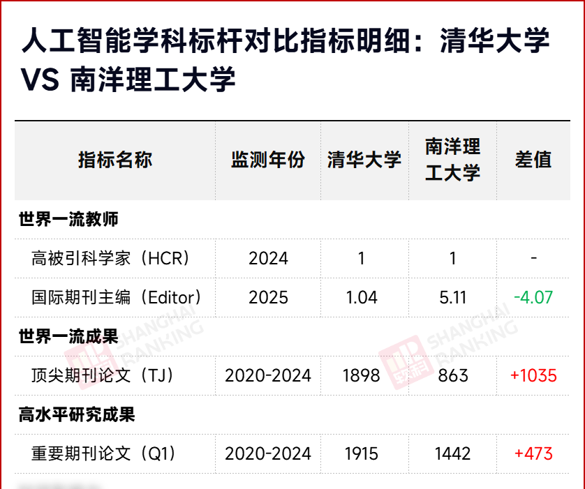 从具体指标来看,清华大学的“高被引科学家”与南洋理工大学的表现相当;“国际期刊主编”仍有差距;“顶尖期刊论文”“重要期刊论文”则远超南洋理工大学。