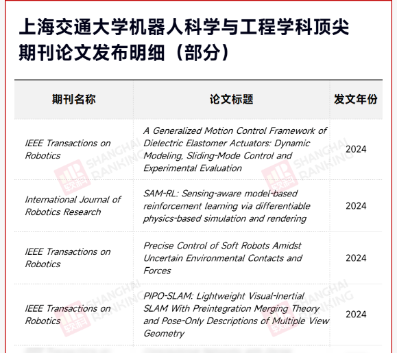 近年来,上海交通大学教师在机器人领域的顶级期刊 IEEE Transactions on Robotics、International Journal of Robotics Research 等发表多项成果。2024年,机器人研究所邹江教授、谷国迎教授,在 IEEE Transactions on Robotics 发表介电弹性体致动器相关研究成果。