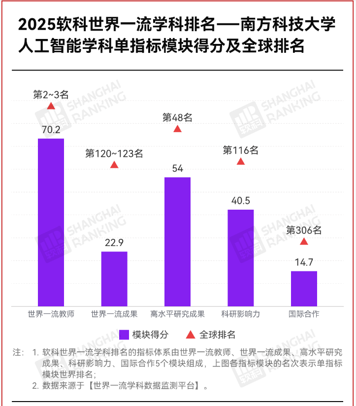 在2025“软科世界一流学科排名”的人工智能学科中,南方科技大学排在全球第18名,中国内地第7名。不过从单指标模块排名来看,学校的“世界一流教师”表现亮眼,与悉尼科技大学并列全球第2名。学校配备了一流的师资力量,并于2024年11月正式成立人工智能高等研究院,汇聚了一批顶尖的科研人才。其中,刘德荣教授、程然教授入选科睿唯安2024年度“全球高被引科学家”名单;同时,刘德荣教授更是在计算机人工智能领域的国际学术期刊 Artificial Intelligence Review 担任主编。