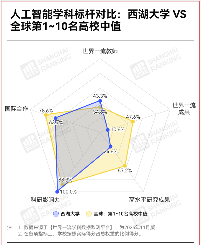 作为一所以高起点、小而精、研究型为特色的新型研究型大学,西湖大学由顶尖科学家领衔,坚持发展有限学科,致力于培养拔尖创新人才。人工智能系是学校的一个重要组成部分,汇聚了一批国内外顶尖的AI学者。在人工智能学科排名中,西湖大学排在全球第44名,中国内地第22名,但其“世界一流教师”模块排至全球第6名,“科研影响力”模块与斯坦福大学、耶鲁大学等15所高校并列全球第1名。