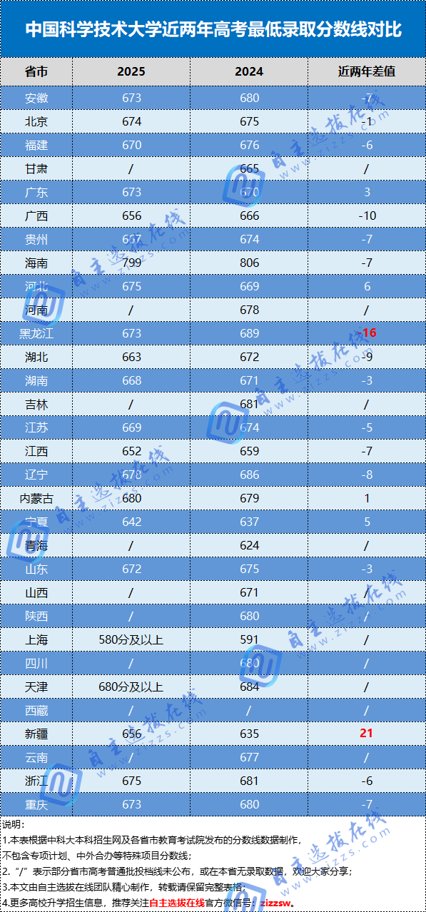 由于中科大是高考出分前校测模式,所以没有入围分数线。自主选拔在线为大家汇总整理了中科大近两年各省市高考最低录取分数线对比,供各位考生家长参考。