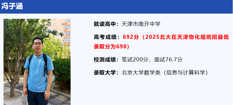 2026年强基计划备战已经开始!有哪些备考经验可以进行参考借鉴?今天为大家分享来自天津市南开中学冯子涵同学的强基备考经历。他曾取得过数学竞赛银牌,信息学竞赛NOIP二等奖,还获得过北大冬令营的“优秀营员”;虽然高考发挥失常,但他通过强基计划破格以及校测完美发挥,成功抓住上岸北大的最后机会!一起来看他是如何做的!