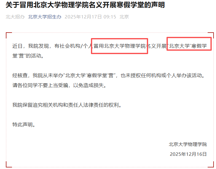 今天,北京大学官方直接下场进行发表声明:北京大学物理学院从未举办“北京大学‘寒假学堂’营”。