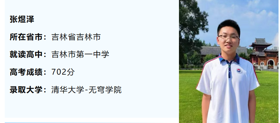2026年强基计划备战已经开始!有哪些备考经验可以进行参考借鉴?今天为大家分享来自吉林市第一中学张煜泽同学的高分进阶经历。他高一便以地区联考第一名入选全国中学生英才计划,还荣获化学、物理竞赛省级三等奖,并参加清华大学暑期营。最终他以702分的高考成绩录取至清华大学无穹书院!一起来看他是如何做到的!