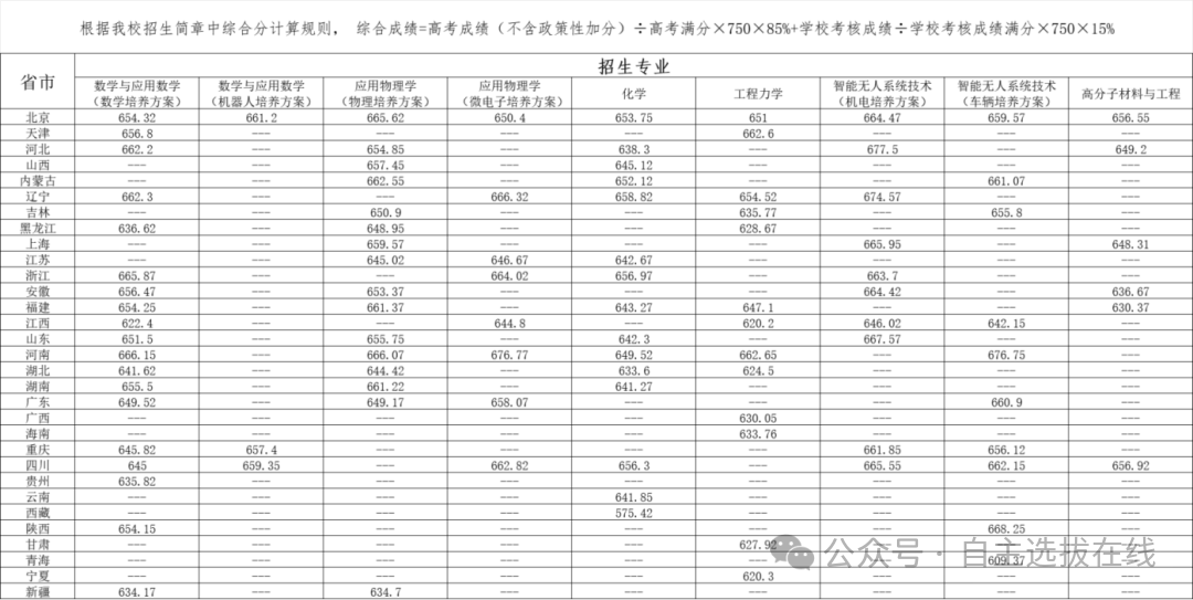 以下是北理工2025年强基计划分省分专业预录取综合成绩最低分数线,因北理工录取分数是由高考成绩与校考成绩核算后的综合成绩,因此参考意义较少,考生家长适当了解即可。