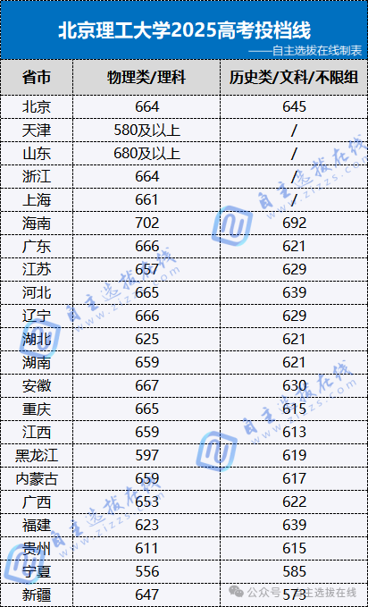 由于北理工强基入围线为数学加权后的成绩,故高于考生真实高考成绩。对比历年数据可以看出,强基计划相对统招会获得5-20左右的降分。为帮助考生家长更精准的进行择校参考,自主选拔在线还准备了北京理工大学2025年各省高考最低投档线: