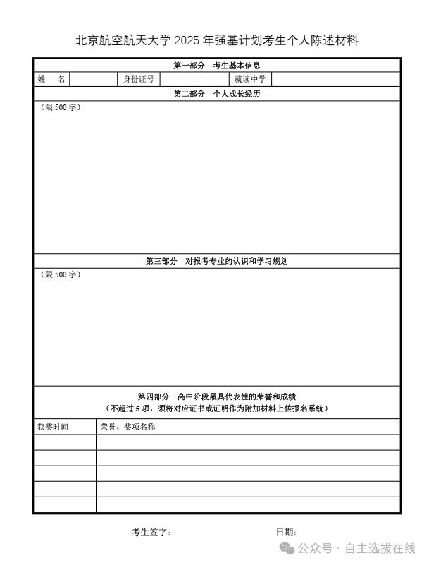 北航要求上传个人陈述材料和对应支撑材料上传至报名系统“附加信息”处。以下是个人陈述材料模板: