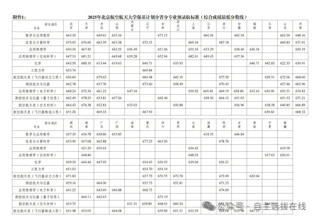 以下是北航2025年强基计划分省分专业预录取综合成绩最低分数线,因北航录取分数是由高考成绩与校考成绩核算后的综合成绩,因此参考意义较少,考生家长适当了解即可。