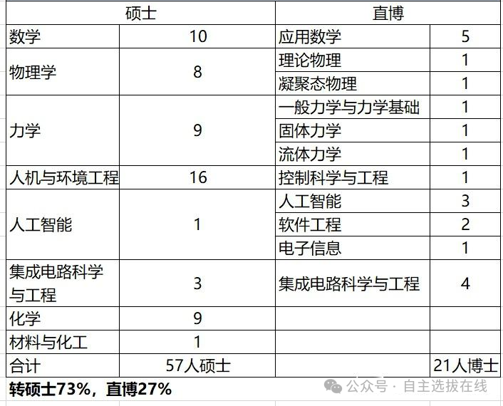 北航未公布2021-2022年强基转段数据,因此以2020级转段情况为例,共有78人通过了强基转段申请:转入硕士阶段57人,占比73%;转入博士阶段21人,占比27%。转段专业包含人工智能、软件工程、电子信息等当下热门专业。