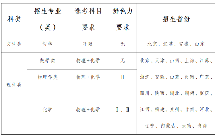 东南大学2025年强基计划招生专业有数学类、物理学类、化学、哲学4大类专业进行招生,其中理科类专业限选物理+化学,哲学类专业不限选科,具体的招生省份及辨色力要求如下: