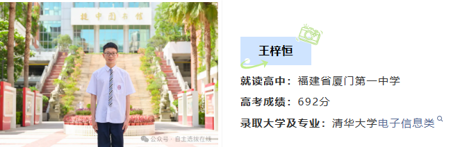 我是厦门一中的王梓恒,高考692分被清华大学电子工程系录取。高一未分科前,成绩是年级12名,到高二下结束年级第五,高三上结束年级第四。我将从一个学生视角分享我平衡竞赛与课内学习的经验和高中学习压力调整的方法。