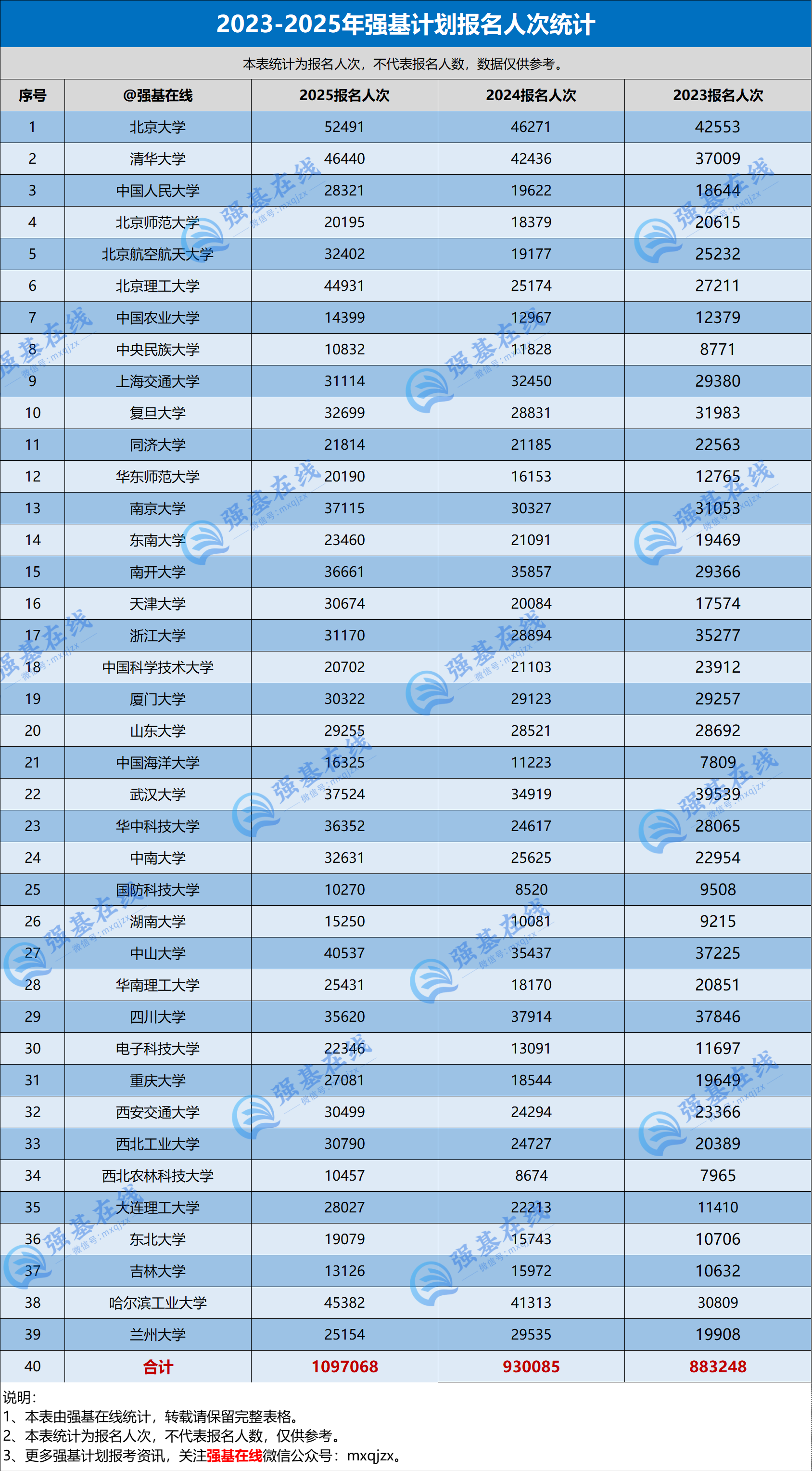 2023-2025年全国985高校的强基计划报名人次状况究竟如何?在这三年中,强基计划的报名人次又呈现怎样的变化趋势?接下来自主选拔在线团队为大家带来2023-2025强基报名人次相关数据介信息,各位考生和家长可以收藏本篇内容,便于及时进行查看!