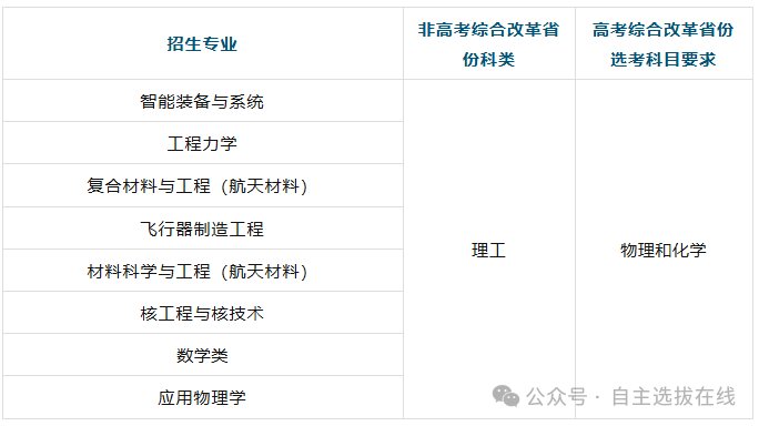 ✅哈工大强基面向全国所有省市招收智能装备与系统、工程力学、复合材料与工程(航天材料)、飞行器制造工程、材料科学与工程(航天材料)、核工程与核技术、数学类、应用物理学共计8个专业。以下是各专业选考科目及身体条件要求: