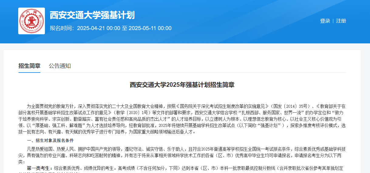 根据西安交通大学2025年强基计划招生简章,强基计划统一在阳光高考特殊招生报名平台进行报名,2025年强基计划报名入口如下: