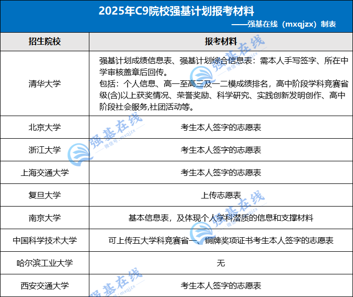 根据25年强基招生简章,C9院校强基计划报名材料汇总如下: