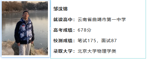 2026年强基计划备战已经开始!又到了自主选拔在线一年一度为大家分享学长学姐成功上岸强基的时候了,今天为大家分享来自云南省曲靖市第一中学邹汶锦同学的北大强基备考经历。他从高一就开始备考强基等特招,参加过数物化竞赛分别获得省二、省三,还参加过北大物理卓越计划和冬令营,最终以678分上岸北京大学强基计划!一起来看他是如何做的!