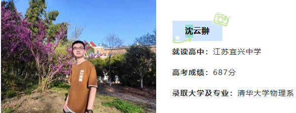 2026年强基计划备战已经开始!有哪些备考经验可以进行参考借鉴?今天为大家分享来自江苏省宜兴中学沈云翀同学的清华备考经历。他从小对物理学科抱有浓厚兴趣,通过自学探索数学物理世界,高中阶段获得物理竞赛金牌,并参加了清华夏令营、北大物理营、北大金秋营等活动,高考以687分、省排前100的成绩,裸分被清华大学物理系录取!一起来看他是如何做的!