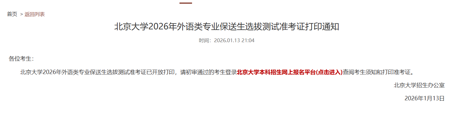 北京大学2026年外语类专业保送生选拔测试准考证已开放打印,请初审通过的考生登录北京大学本科招生网上报名平台(https://www.ccuut.edu.cn/admission_pku/login.php)查阅考生须知和打印准考证。